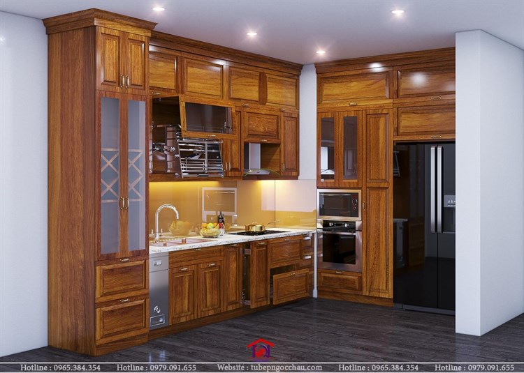 Lựa chọn nguyên liệu cho bộ tủ bếp không thể thiếu nguyên liệu gỗ Gõ, đây là dòng gỗ tự nhiên có độ bền cao chắc chắn, có khả năng chịu lực, thích ứng với điều kiện thời tiết của Việt Nam và mang lại tính thẩm mĩ cao, sang trọng, lịch sự. Bộ tủ bếp gỗ Gõ của Nội thất Ngọc Châu được thiết kế nhấn mạnh vào công năng sử dụng hằng ngày nhưng vẫn bảo đảm tính thẩm mỹ.