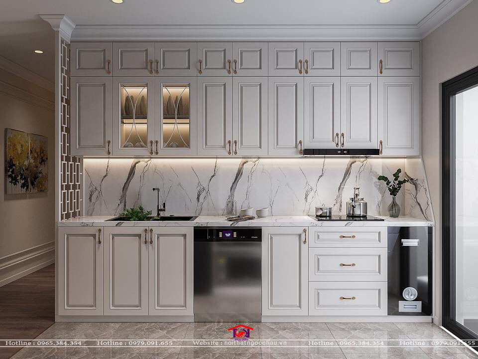 Anh Sơn sử dụng chủ yếu tông màu trắng cho không gian phòng khách và phòng bếp, tạo sự thống nhất trong nội thất. Với chất liệu được làm từ gỗ MDF chống ẩm An Cường và phủ lên bề mặt lớp sơn 2k chống trầy xước tốt, càng tăng nên độ bền của nội thất.