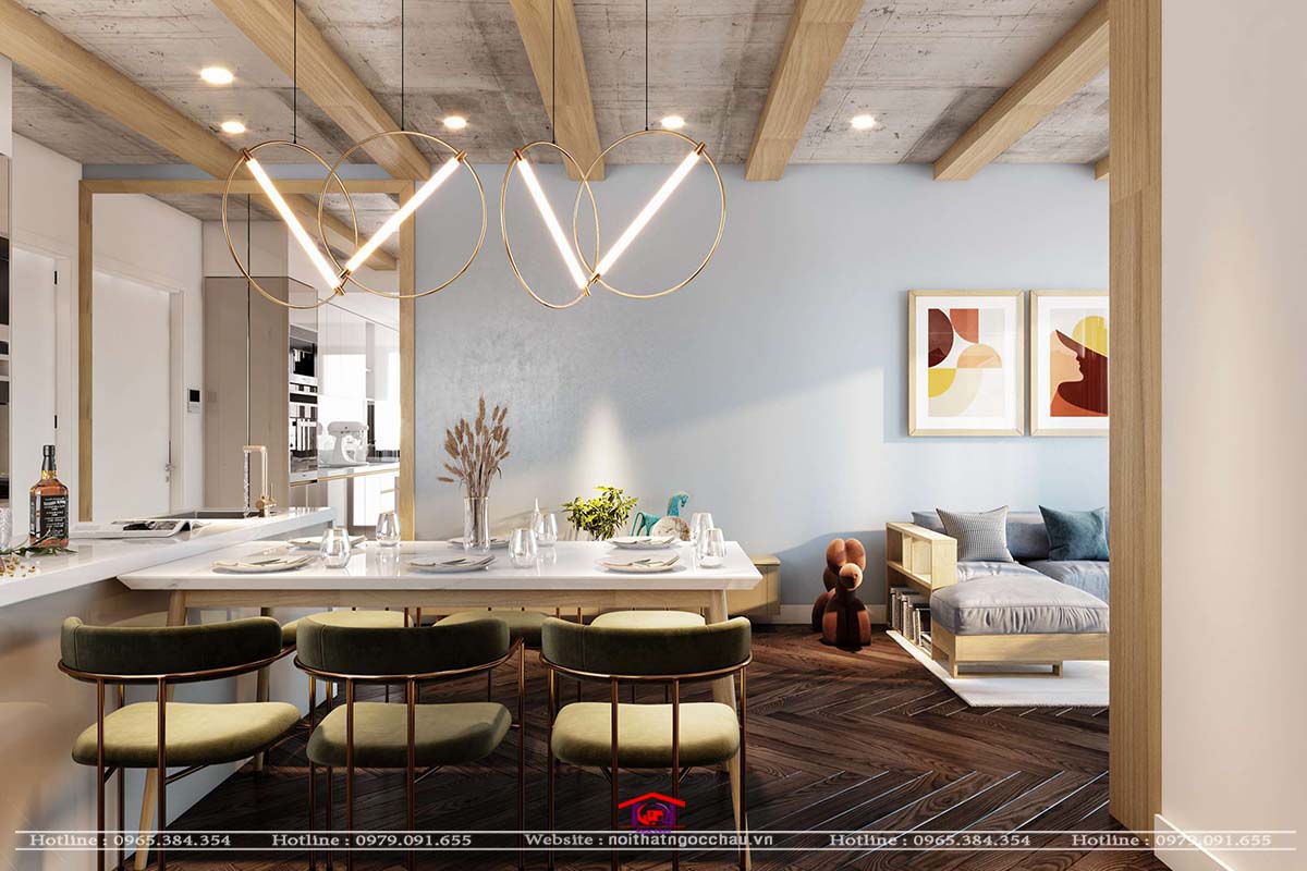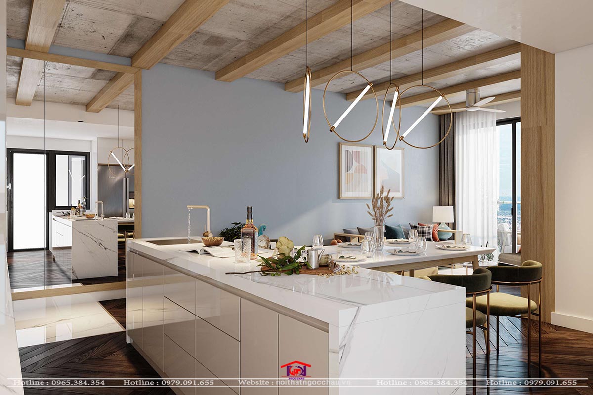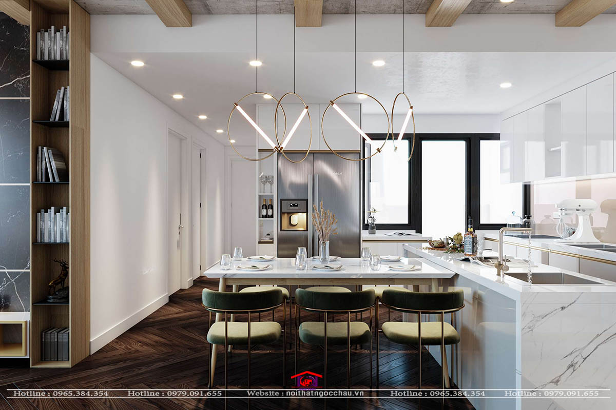 Phòng khach với phòng bếp liên nhau nên tao ra một không gian liên thông cho phòng, với hệ thống tủ bếp được làm bằng chất liệu nhựa Acrylic bóng gương. Kết hợp phòng bếp với phòng khách là hệ quầy ba bàn đảo sau đó là bộ bàn ăn nhập khẩu.